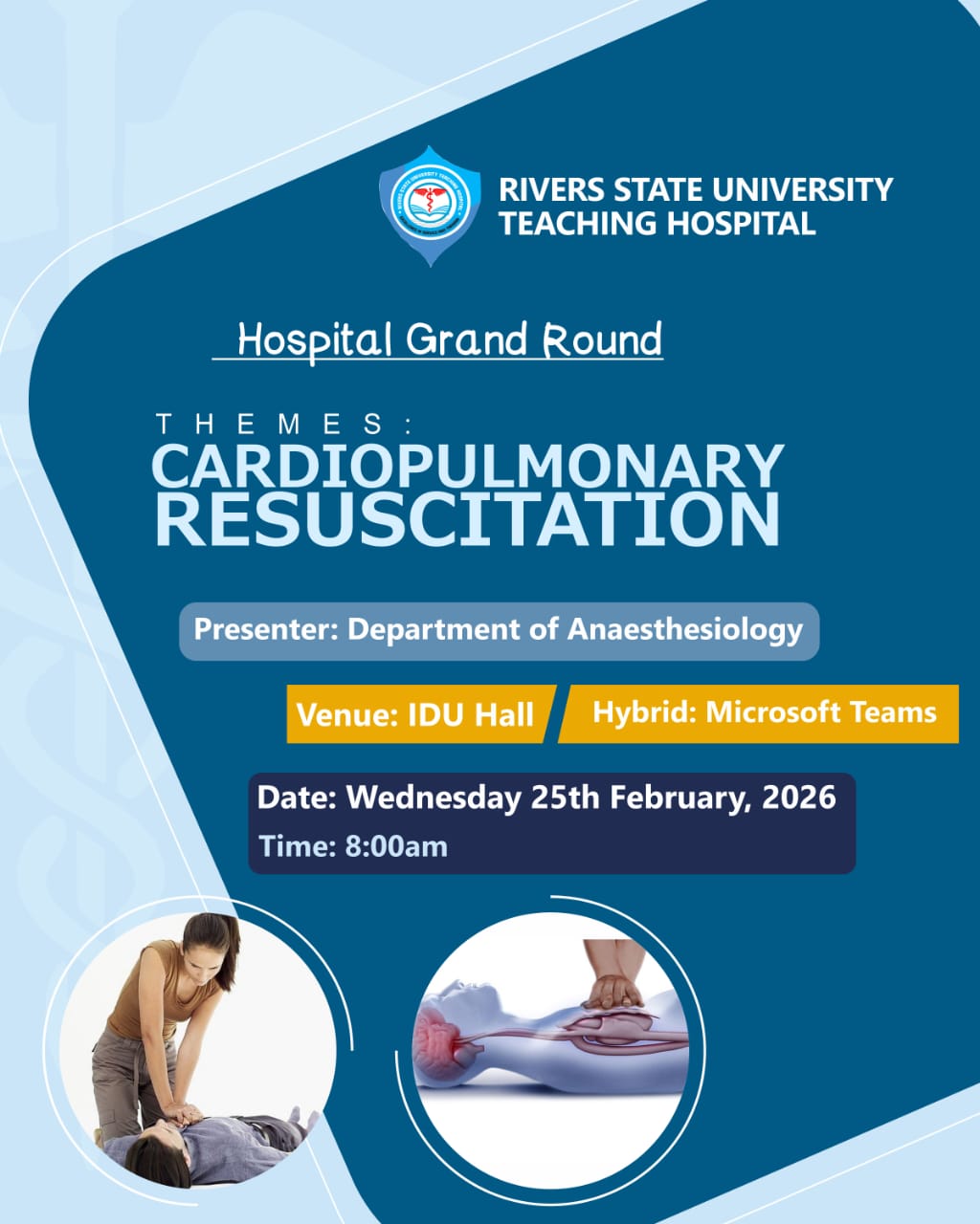 In line with the commitment of the Chief Medical Director (CMD) of Rivers State University Teaching Hospital (RSUTH), Professor Chizindu A. Alikor, to enhance public awareness and hospital preparedness for cardiac emergencies, the Department of Anaesthesiology organized a Hospital Grand Round on Cardiopulmonary Resuscitation (CPR) on February 24, 2026.